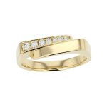 A plain polished section contrasts with grain set diamonds in this crossover dress ring designed and made by Faller. Currently M3/4 finger size, we would be happy to resize this 18ct yellow gold ring to fit a range of sizes free of charge. It is packaged in our green Faller ring box.