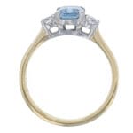 This Faller aquamarine ring has a four-claw set octagon cut faceted aquamarine centre stone with a round brilliant cut diamond claw set on each side. The platinum setting is supported by a slightly tapered 18ct yellow gold band. This gorgeous Faller ring works equally well as an alternative engagement ring or as a beautiful dress ring to celebrate a special birthday. It is packaged in our green Faller ring box.