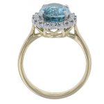 This Faller halo ring features an oval cut faceted vibrant blue zircon from Cambodia. It is held by four claws and surrounded by a halo of claw set round brilliant cut diamonds.  The platinum setting is supported by a tapered 18ct yellow gold band. This gorgeous Faller ring would be an attractive dress ring to celebrate a special birthday or anniversary. It is packaged in our green Faller ring box.