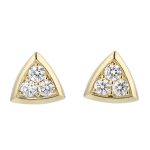 These earrings are made in 18ct yellow gold with posts and butterfly backs. Three diamonds are grain set in each illusion triangular rim setting. Designed and made by Faller, they are packaged in our distinctive green Faller earring box.