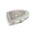 This Faller dress ring is inspired by the floral detail at the bottom of the Galloglas Stone located at Clonca, Inishowen, Co. Donegal. The Fleur-de-lys, ( French: “lily flower”) motif is associated with both the Virgin Mary and with the Holy Trinity. The top of this sterling silver ring has a brush-finished outer frame inset with floral detail. The rest of the ring is polished. The ring is curved inside for comfort fit. Available in a range of sizes, it is packaged in its branded Faller box with our Galloglas descriptive leaflet.