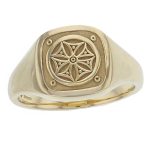 An 18ct yellow gold Marigold stone signet ring, designed and made by Faller. The 13.5mm x 13.5mm cushion shape top of the ring in deeply engraved with a pattern derived from the Marigold Stone. This ring is packaged in our green Faller ring box.