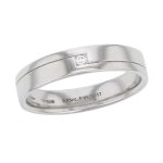The pattern is centred in this polished flat platinum ring. The diamond is grain set in a square frame with grooves either side. The inside of this 5mm wide band is curved for comfort. The band is 1.7mm thick. This ring can be made to order in your finger size.