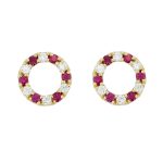 Eternal Circle stud earrings designed & made by Faller. Each earring is a circle of alternating claw set round brilliant cut diamonds and intense transparent round brilliant cut rubies. They are made in 18ct yellow gold with posts and butterfly backs. These stunning ruby and diamond earrings are packaged in our green Faller earring box.