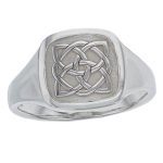 A polished sterling silver signet ring, designed and made by Faller. The 13.5mm x 13.5mm cushion shape top of the ring in deeply engraved with a Celtic Quad knot pattern. This ring can be made to order in a range of finger sizes. It is packaged in our green Faller ring box.