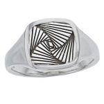 A polished sterling silver signet ring, designed and made by Faller. The 13.5mm x 13.5mm cushion shape top of the ring in deeply engraved with a spiralling steps pattern. This ring can be made to order in a range of finger sizes. It is packaged in our green Faller ring box.